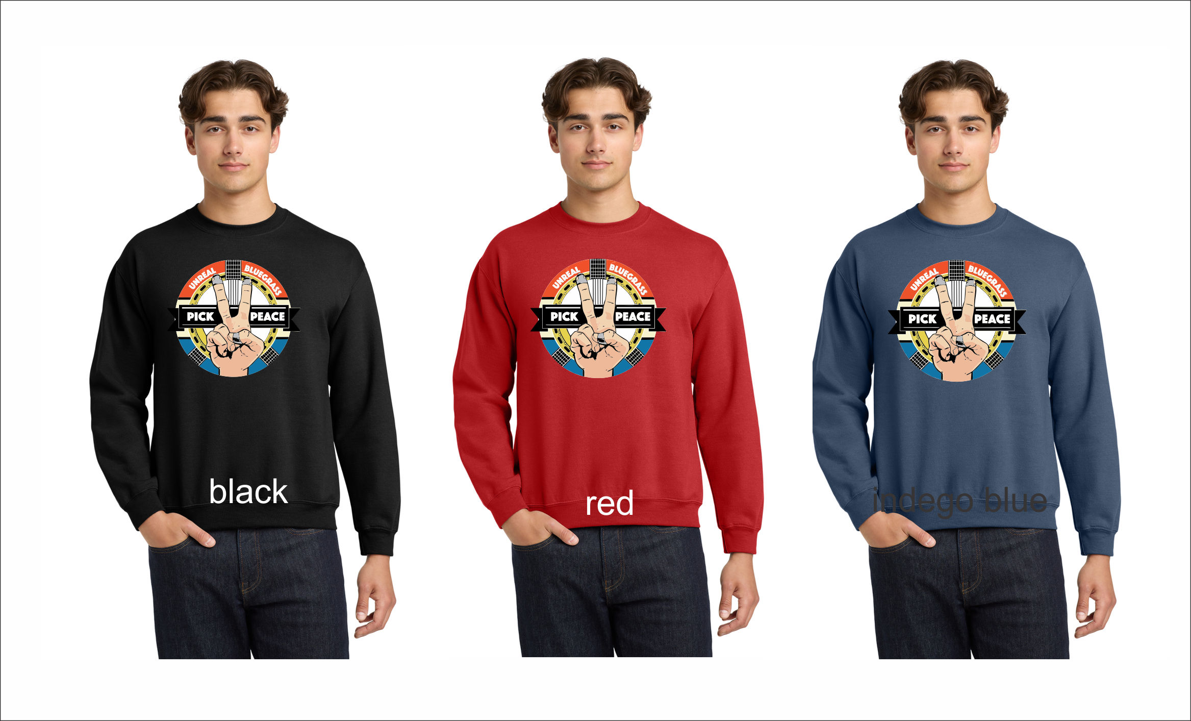 Full chest Pick Peace logo printed on front chest.available sizes youth med - adult 5xl (youth crew is royal blue)