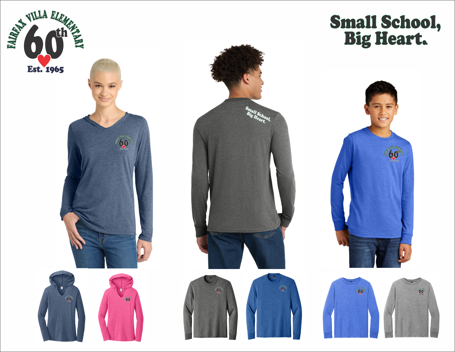 A multi color left chest logo & a stylish print on the back shoulder reminding everyone that Fairfax Villa really is "the little school with th e big heart".